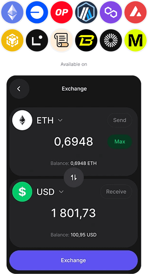 Buy, store, swap, sell, and spend your assets. All from one powerful crypto app. No centralized exchange, no excessive markups, just true control across the top chains.